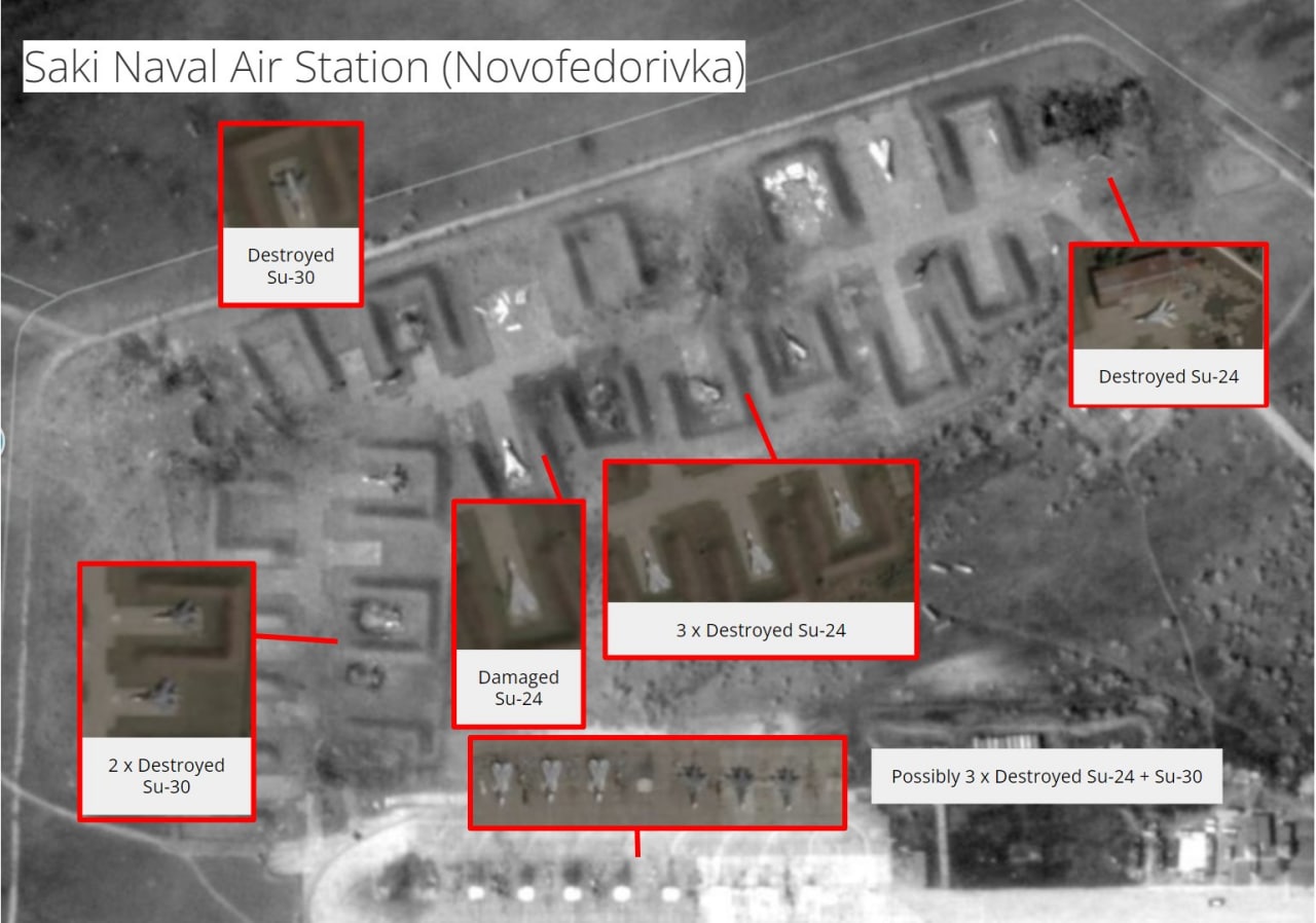 "Большие воронки выделяются в трех разных точках на авиабазе "Саки". Это еще больше увеличивает вероятность того, что авиабаза была поражена. Ущерб огромен. Безусловно, очень черный день для российской морской авиации", - отмечают аналитики.