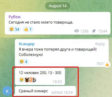 "Я вчера тоже потерял друга и товарищей! Соболезную! 12 человек "200-х", 13 "300-х". Сраный химарс", - пишет российский источник.