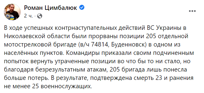 На своей странице в социальной сети Facebook он отметил, что прорыв украинских военных на Николаевщине произошел в одном из населенных пунктов. При этом наибольшие потери понесла 205-я мотострелковая бригада ВС РФ, на которую пришелся один из самых тяжелых ударов ВСУ. Российская бригада была переброшена на территорию Украины из Буденновска, где дислоцируется в военной части по номеру 74814.