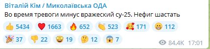 Глава Николаевской ОВА Виталий Ким подтвердил информацию об уничтожении штурмовика россиян.