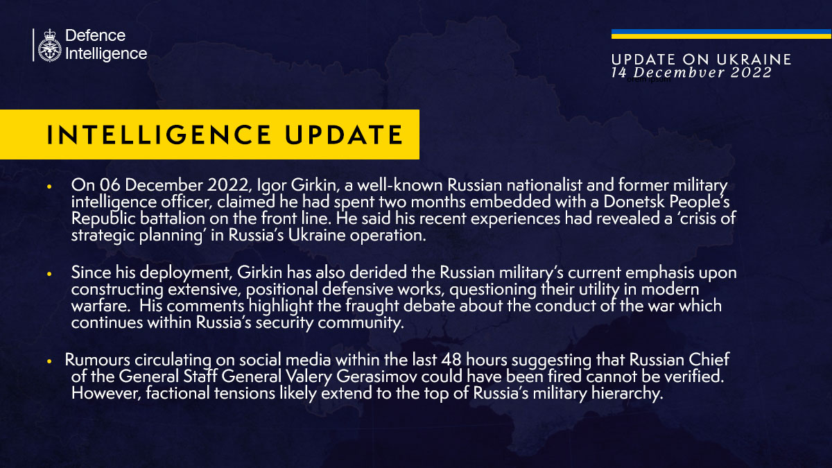 Сегодня, 14 декабря, в пресс-службе Минобороны Британии со ссылкой на данные разведки озвучили информацию о Гиркине.
