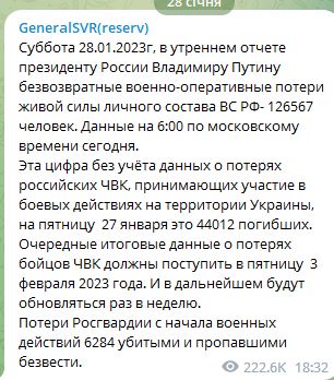 Отметим, что Генштаб ВСУ публикует более скромные цифры потерь российской армии. Согласно официальным данным украинской стороны, на утро 29 января общие потери оккупантов убитыми составили 126 160, из которых 650 лишились жизни за последние сутки.