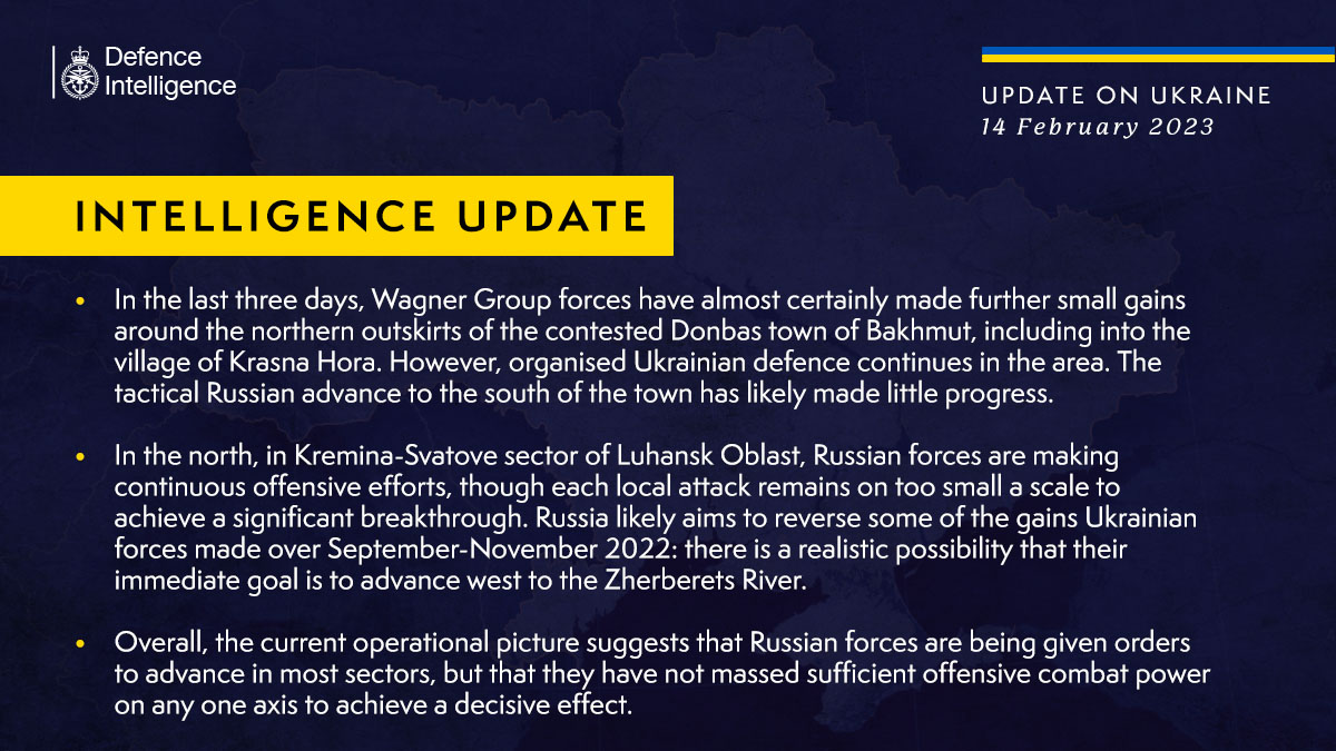 Сегодня, 14 февраля, в пресс-службе Минобороны Британии озвучили главные тезисы по боям за Бахмут.