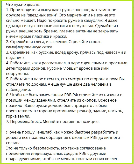 Украинский военнослужащий и эксперт по радиотехнологиям с псевдонимом Сергей Флеш в своем ТГ-канале "Про зв'язок від Сергія Флеш" предупредил братьев по оружию об опасности "беготни" по позициям с антидрон-оружием, когда над тобою нависает БПЛА врага.