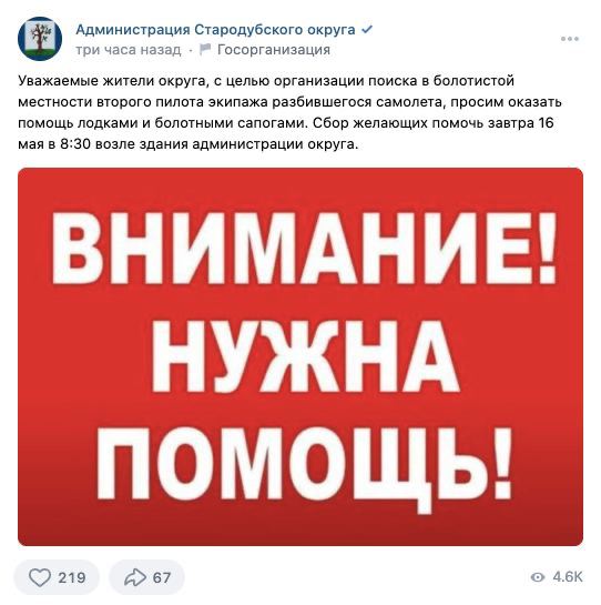 15 мая администрация Стародубского округа Брянской области опубликовала в соцсети пост с просьбой к местным жителям помочь в поиске второго пилота сбитого средствами ПВО самолета.
