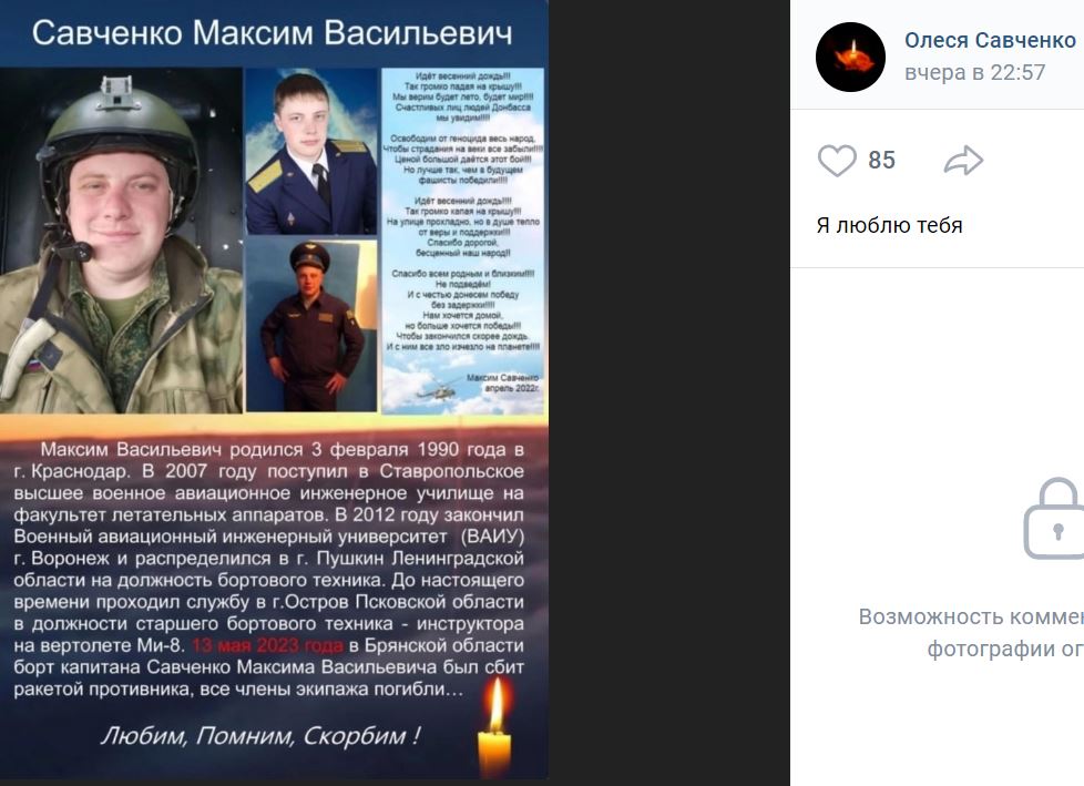 Международные OSINT-исследователи уже идентифицировали личность первого из девяти сбитых 13 мая пилотов. Исследователь Иракли Комахидзе отметил, что ПВО приняла за цель борт "Ми-8", в котором находился 33-летний Максим Савченко. Его страница в соцсети уже закрыта, однако жена оккупанта подтвердила крушение вертолета и гибель мужа.