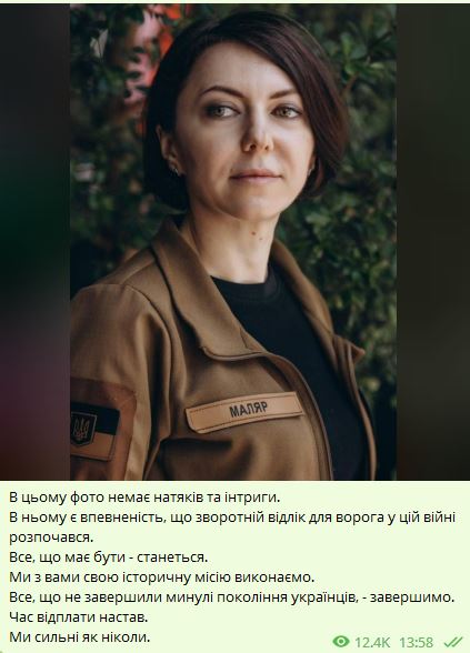 "Обратный отсчет для врага в этой войне начался. Все, что должно, произойдет. Мы с вами свою историческую миссию выполним. Все, что не завершили прошлые поколения украинцев, завершим. Час расплаты наступил. Мы сильны как никогда", - написала Маляр.