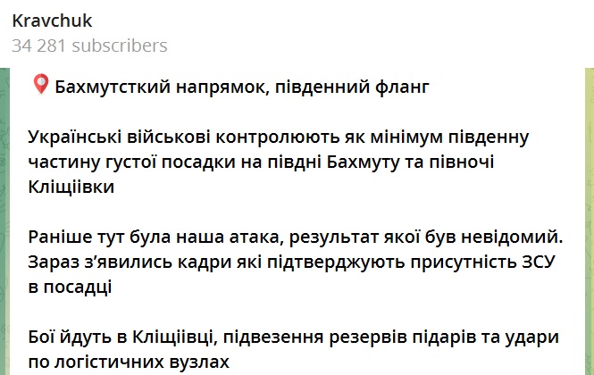 Ранее на Южном фланге штурмовые подразделения ВСУ предприняли атаку, о результатах которой публично не сообщалось. Однако на появившихся новых видео появились подтверждения того, что украинская армия уже заняла посадку. На данный момент боевые действия идут в Клещеевке, контроль над которой даст возможность значительно ускорить уничтожение российской группировки в Бахмуте.