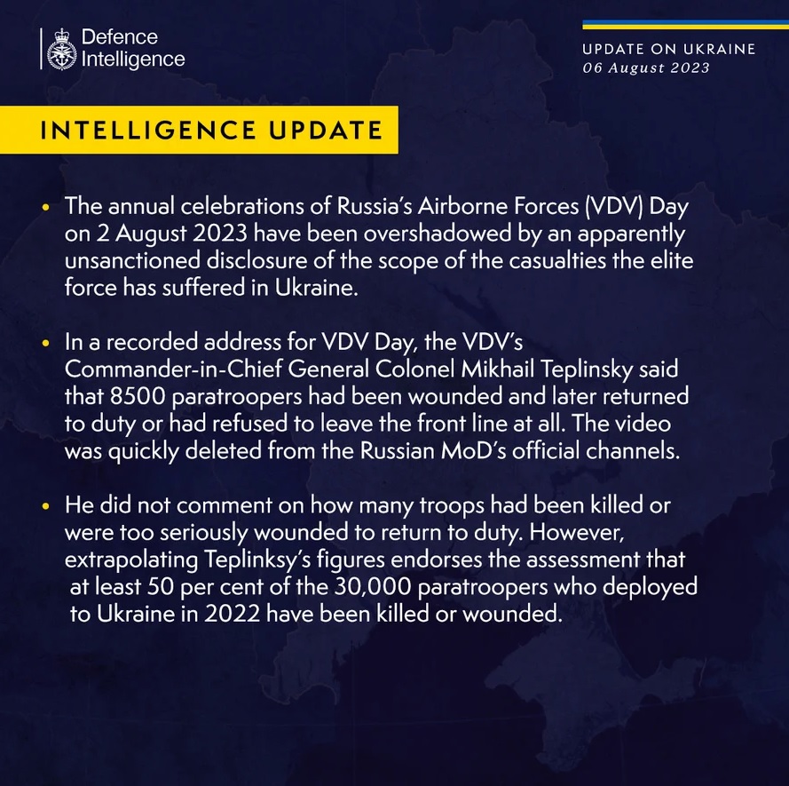 По данным британской разведки, огромные масштабы российских потерь удалось установить благодаря несанкционированной утечке информации со стороны российского командования 2 августа. В сообщении отмечено, что в этот день главнокомандующий десантных войск РФ генерал Михаил Теплинский во время публичного выступления рассказал, что 8500 десантников получили ранения, но вернулись в строй и не покинули фронт.