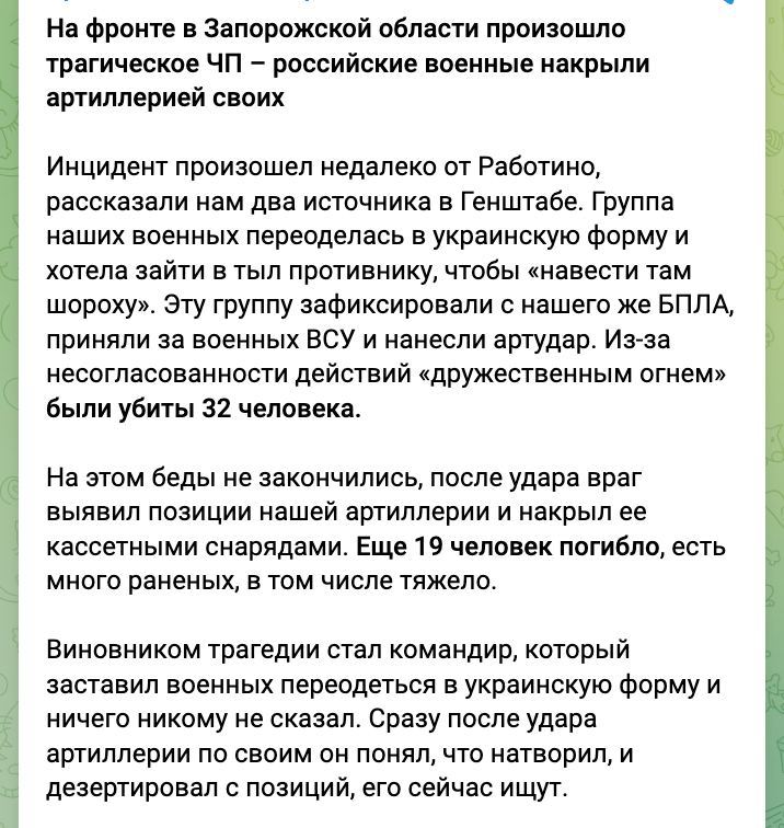 Недалеко от Работино в Запорожской области российские оккупанты накрыли артиллерией своих. Z-каналы сообщают, что группа захватчиков переоделась в форму ВСУ и хотела зайти в тыл защитников. Однако российское БПЛА зафиксировало их передвижение, группу приняли за ВСУ и нанесли артудар. "Дружественным огнем" были убиты 32 российских военнослужащих.
