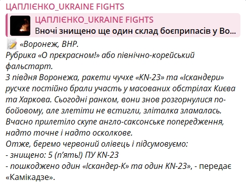 Есть информация о том, что при атаке мог быть поражен склад с северокорейскими ракетами KN-23, а также с российскими "Искандерами", которые использовались для ударов по Киеву и Харькову. Предварительно, помимо боеприпасов, поражены и пусковые установки. Однако эта информация требует уточнения.