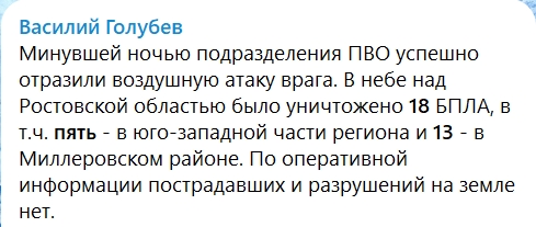 Губернатор Ростовской области Василий Голубев отметил, что 13 БПЛА были сбиты именно над Миллеровским районом. При этом он соврал, что "пострадавших и разрушений на земле нет". Вскоре он был вынужден уточнить, что начался лесной пожар после атаки, но не у Миллерово, а в Милютинском районе.