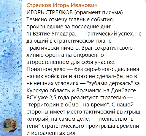 "Взятие Угледара — тактический успех, не дающий в стратегическом плане практически ничего. Враг сократил свою линию фронта на второстепенном для себя участке… "Зубами держась" за Курскую область и Волчанск, на Донбассе ВСУ уже 2,5 года реализуют стратегию — территории в обмен на время", — написал Стрелков.