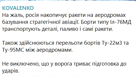 По его данным, наблюдаются четкие признаки подготовки России к налету. С помощью транспортников "Ил-76МД" на аэродромах стратегической авиации ВКС РФ накапливаются ракеты, топливо, запчасти и прочее.