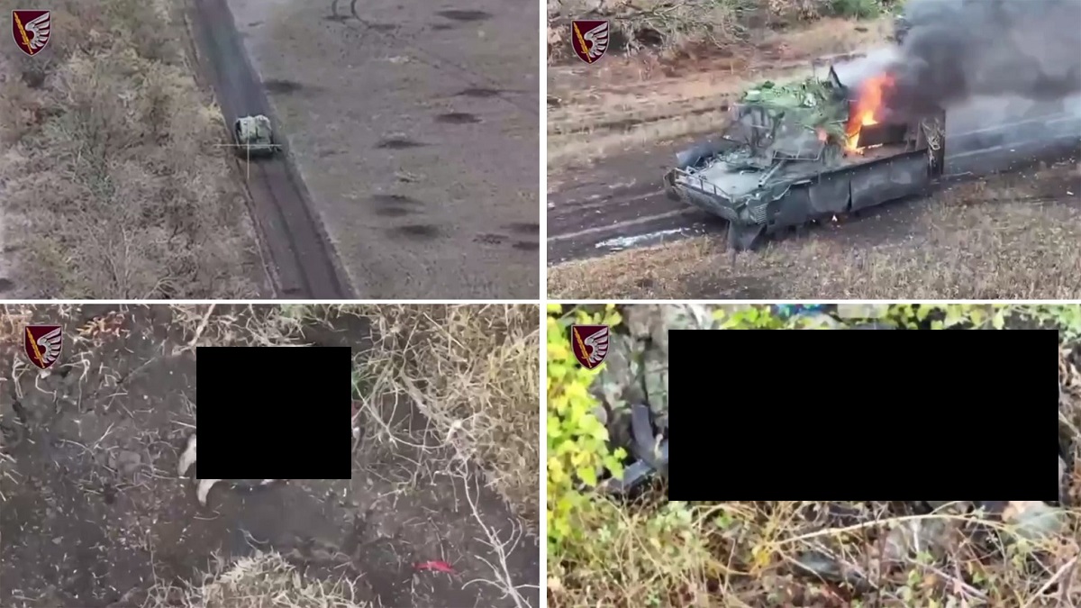 На опубликованном в Сети видео горит подбитая российская бронетехника, а также тела погибших оккупантов, которые были ликвидированы с дистанции.
