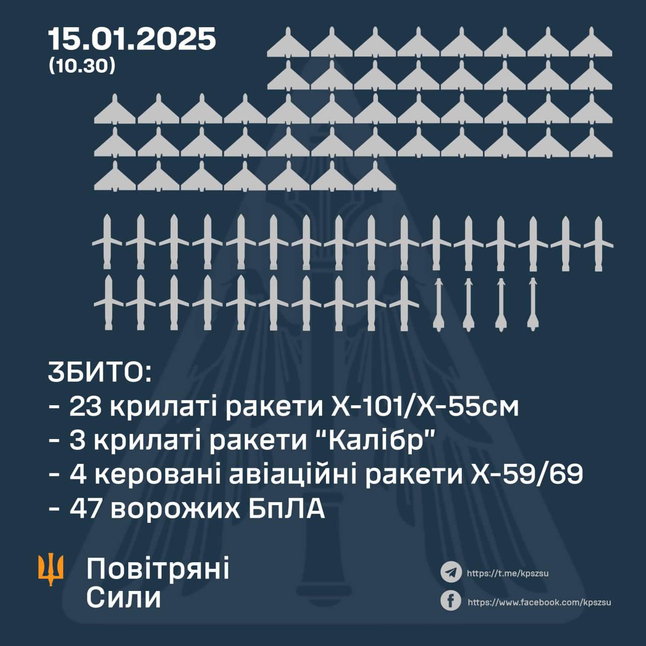 Ночью и утром 15 января россияне запустили по Украине 117 средств поражения, среди которых крылатые ракеты, баллистика и ударные дроны.