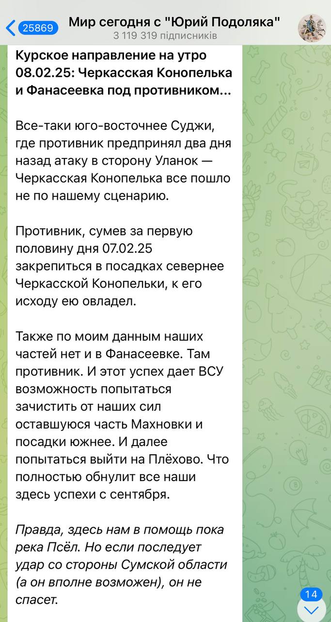 Также Подоляка опасается украинского удара со стороны Сумской области по тылу российской группировки, расположенной за рекой Псел.