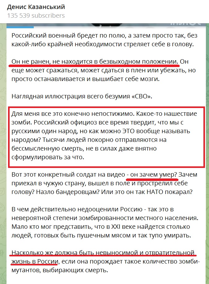 Этот случай стоит особняком, поскольку ранее оккупанты убивали себя на фронте в безвыходной ситуации, однако тут иной случай. Более того, ежемесячно тысячи россиян покорно отправляются на верную смерть, не имея ни понимания целей этой войны, ни желания сопротивляться. Их жизнь не имеет для Кремля никакой ценности, а пропаганда превращает их в зомбированную массу, готовую уничтожать себя просто потому, что так приказано.