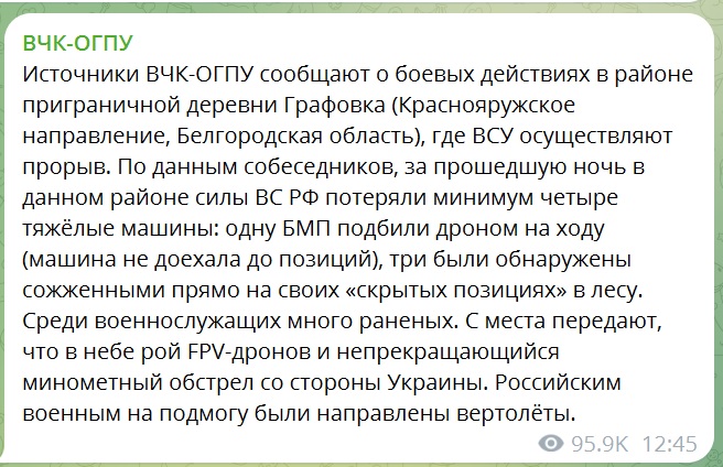 Российские военные Telegram-каналы первыми сообщили о попытке прорыва ВСУ в Белгородскую область. В частности, близкий к российским спецслужбам канал "ВЧК-ОГПУ" передал информацию о боевых действиях в районе приграничной деревни Графовка (Краснояружское направление). По данным их источников, за ночь российская армия потеряла минимум четыре тяжелые боевые машины: одну БМП уничтожил украинский дрон на марше, еще три были сожжены на "скрытых позициях" в лесу. На месте много раненых среди российских военнослужащих, а небо заполнили рои украинских FPV-дронов. Российские войска были вынуждены запрашивать поддержку вертолетов.