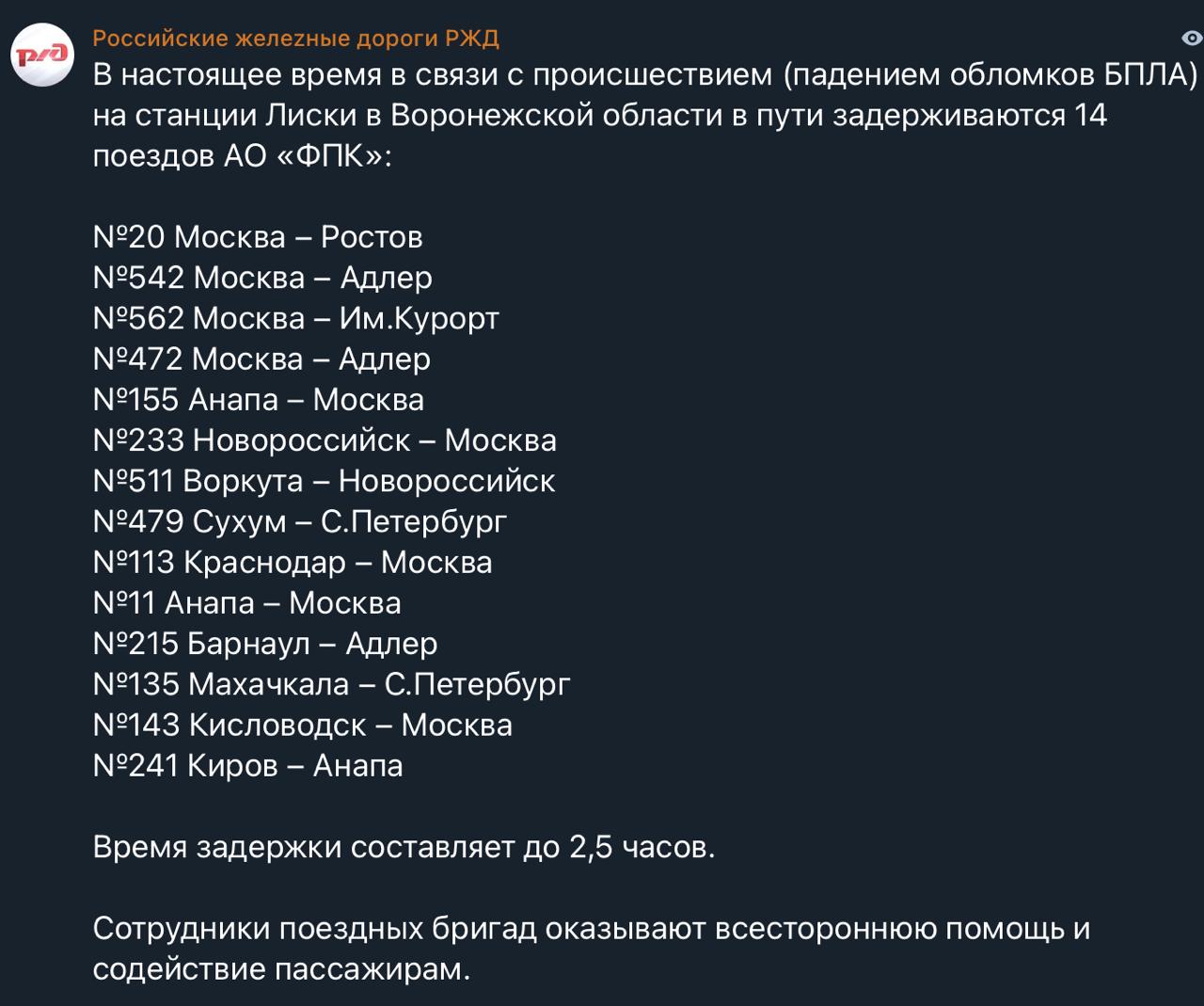 Удар по станции вызвал серьезные перебои в работе железной дороги агрессора. По последним данным, задержаны как минимум 14 пассажирских составов, среди которых поезда Москва - Ростов, Москва - Адлер, Новороссийск - Москва, Сухум - Санкт-Петербург, Барнаул - Адлер, Махачкала - Санкт-Петербург, Кисловодск - Москва и другие.