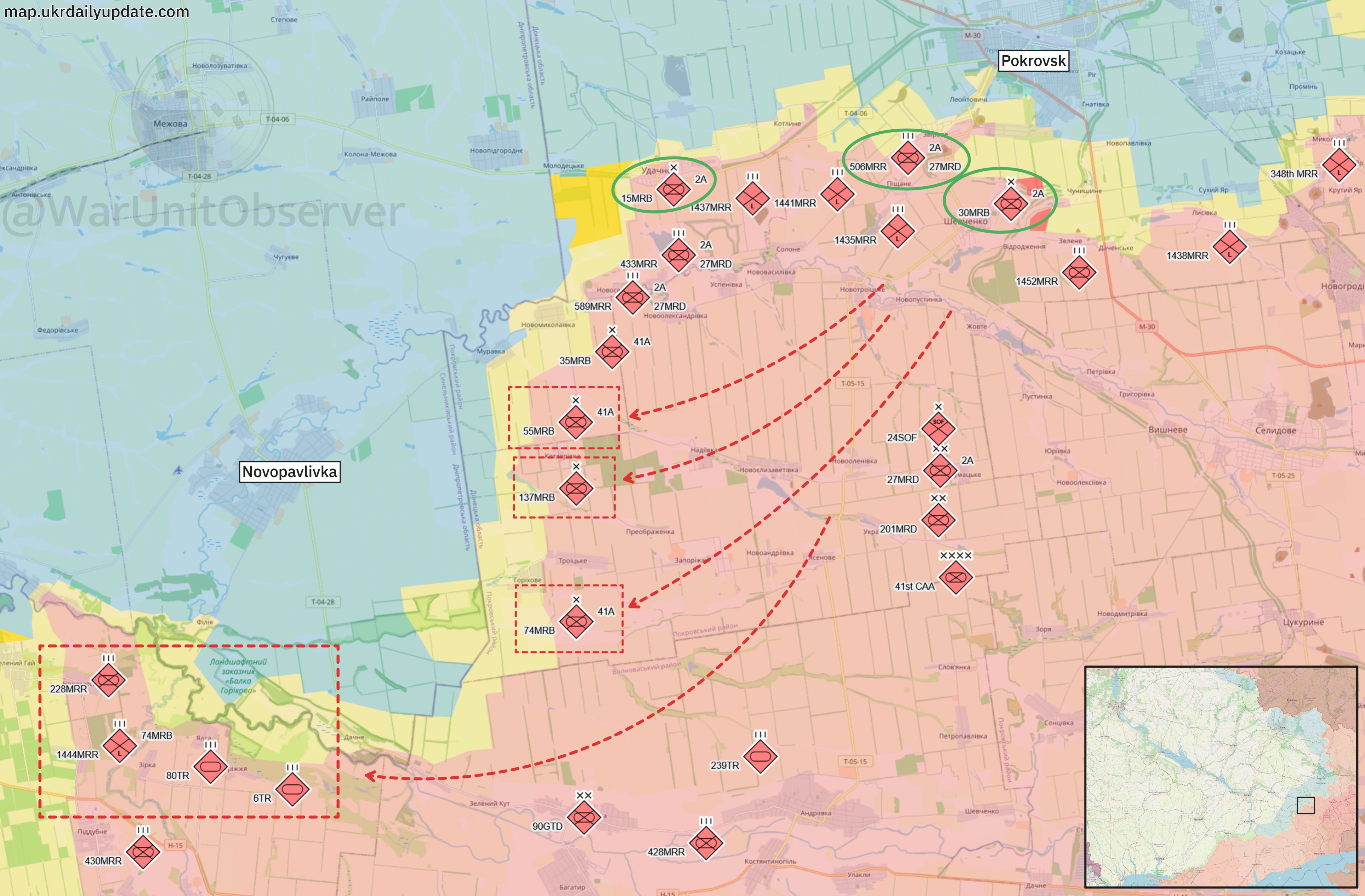 Вчера, 8 октября, OSINT-аналитик UnitObserver сообщил о том, что подразделения 35-й, 55-й, 74-й и 137-й отдельных мотострелковых бригад переброшены с юга Покровска на Новопавловское направление.