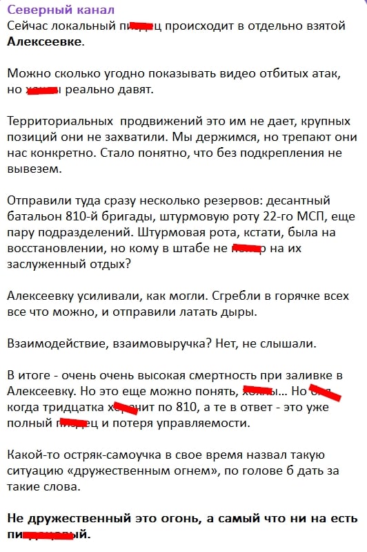 "Можно сколько угодно показывать видео отбитых атак, но ВСУ реально давят… Трепают они нас конкретно. Стало понятно, что без подкрепления не вывезем. Отправили туда сразу несколько резервов: десантный батальон 810-й бригады, штурмовую роту 22-го МСП, еще пару подразделений… Алексеевку усиливали, как могли. Сгребли в горячке всех все, что можно, и отправили латать дыры. Взаимодействие, взаимовыручка? Нет, не слышали. В итоге очень-очень высокая смертность при заливке в Алексеевку", - написал канал.
