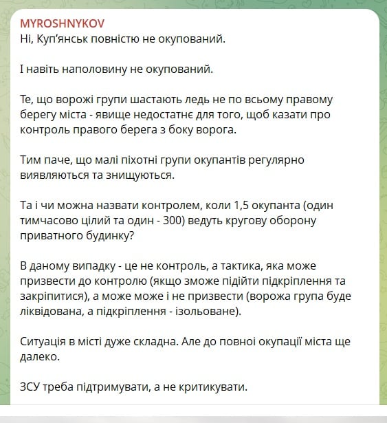 "Купянск даже наполовину не оккупирован. То, что вражеские группы шатаются почти по всему правому берегу города, — явление недостаточное для того, чтобы говорить о контроле правого берега со стороны врага, тем более что небольшие пехотные группы оккупантов регулярно обнаруживаются и уничтожаются", — отмечает он.