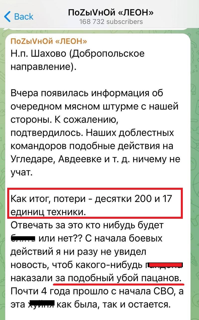 Под Добропольем в ходе штурма села Шахово зафиксирована очередная волна так называемых "мясных штурмов" — плохо подготовленных атак, в которых российские военные несут огромные потери. Об этом сообщил один из известных военных пропагандистов под ником "ЛЕОН" (168 000 подписчиков), возмущенно заявив, что ситуация повторяется уже четвертый год подряд.