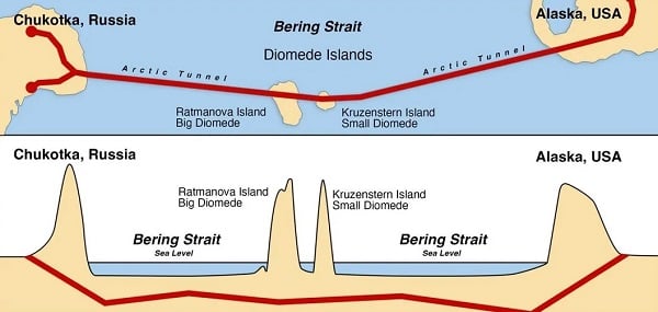 Идею тоннеля до Аляски поднял спецпредставитель президента РФ по экономическому сотрудничеству с зарубежными партнерами Кирилл Дмитриев. Член окружения Путина и генеральный директор Российского фонда прямых инвестиций убежден, что тоннель должен проходить по Беринговому проливу, предложение он изобразил визуально.