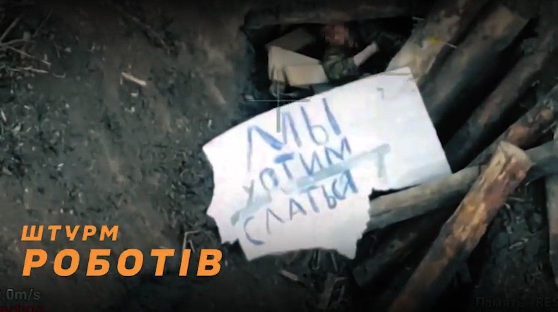 Сначала дрон-камикадзе поразил блиндаж противника. Следом за ним на позицию заехал наземный робот, начиненный взрывчаткой. После второго удара камера воздушного дрона зафиксировала невероятное: из разрушенного укрытия вышел российский солдат и поднял над собой кусок картона с надписью "Мы хотим сдаться".