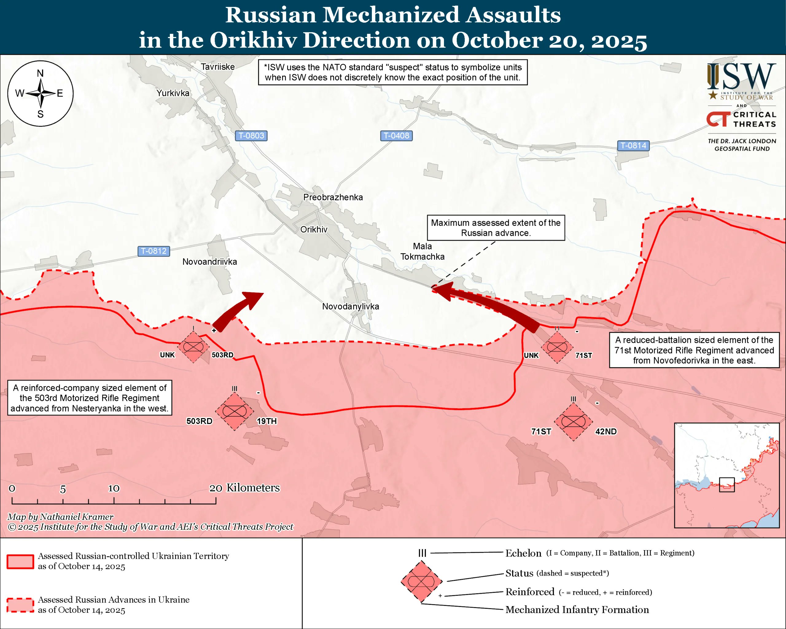 20 и 21 октября российские войска атаковали юго-восточнее Орехова в районе Малой Токмачки и западнее Орехова в районе Степового, Щербаков, Каменского, Плавней, Приморского и Степногорска, а также в направлении Новоандреевки, сообщают аналитики из Института изучения войны.