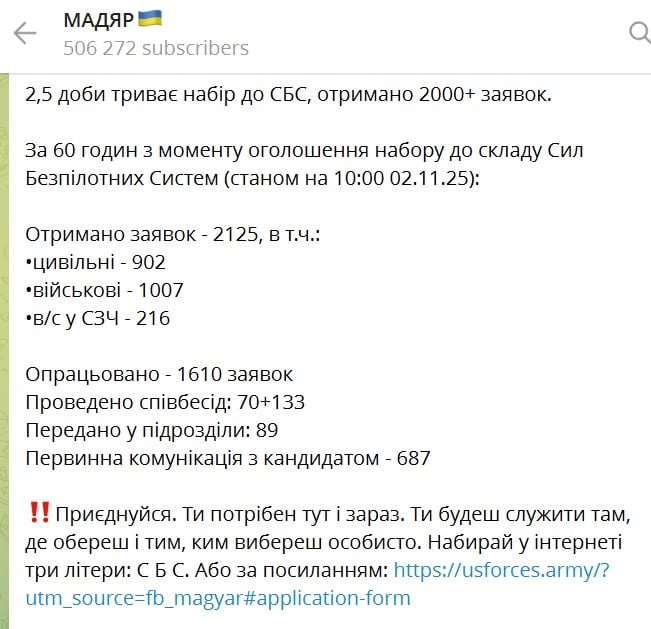 Мадяр ранее объявил о масштабном наборе — открыто более 15 000 вакансий. Подразделение ищет операторов дронов, техников, инженеров, аналитиков, механиков и координаторов воздушных миссий. Главный принцип нового подхода — человек сам выбирает, где и кем он будет служить.
