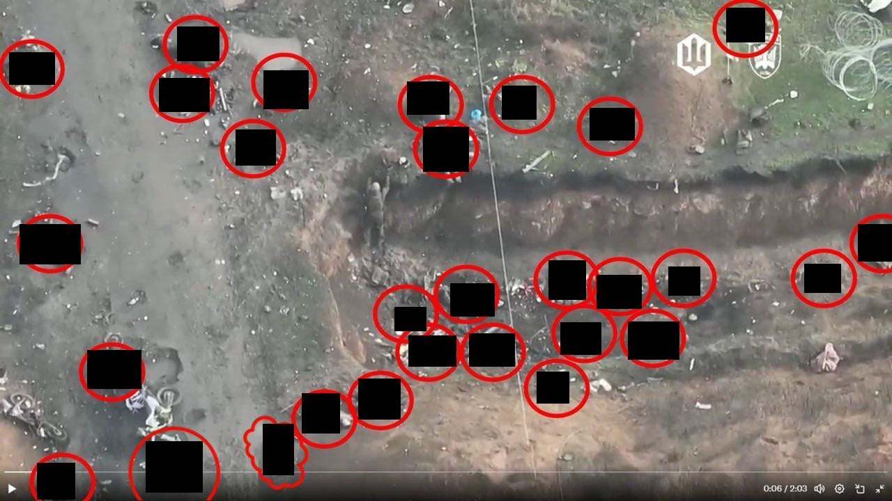 На опубликованных кадрах видны десятки тел российских солдат, лежащих в глубоких траншеях и на подступах к ним. Красные круги, которыми военные аналитики отметили погибших, занимают почти весь кадр — наглядная демонстрация того, насколько дорого Москве обходятся попытки прорвать новые укрепрайоны Украины.