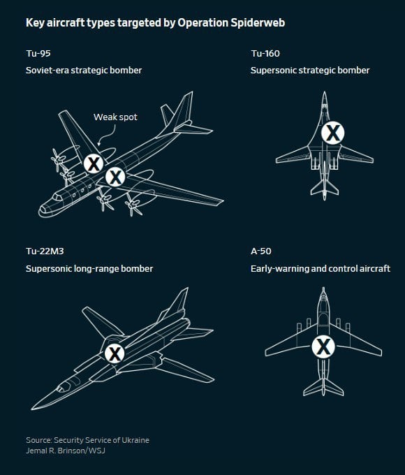 The Wall Street Journal опубликовало детальное расследование об украинской операции "Паутина", в рамках которой этим летом СБУ атаковала дальние бомбардировщики на аэродромах в Рязанской, Ивановской, Мурманской, Иркутской и Амурской областях РФ.