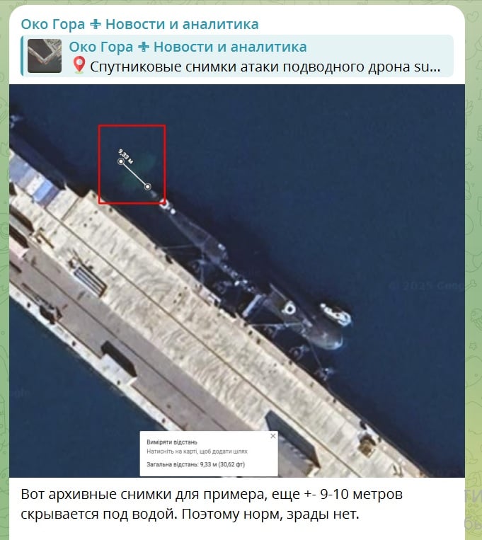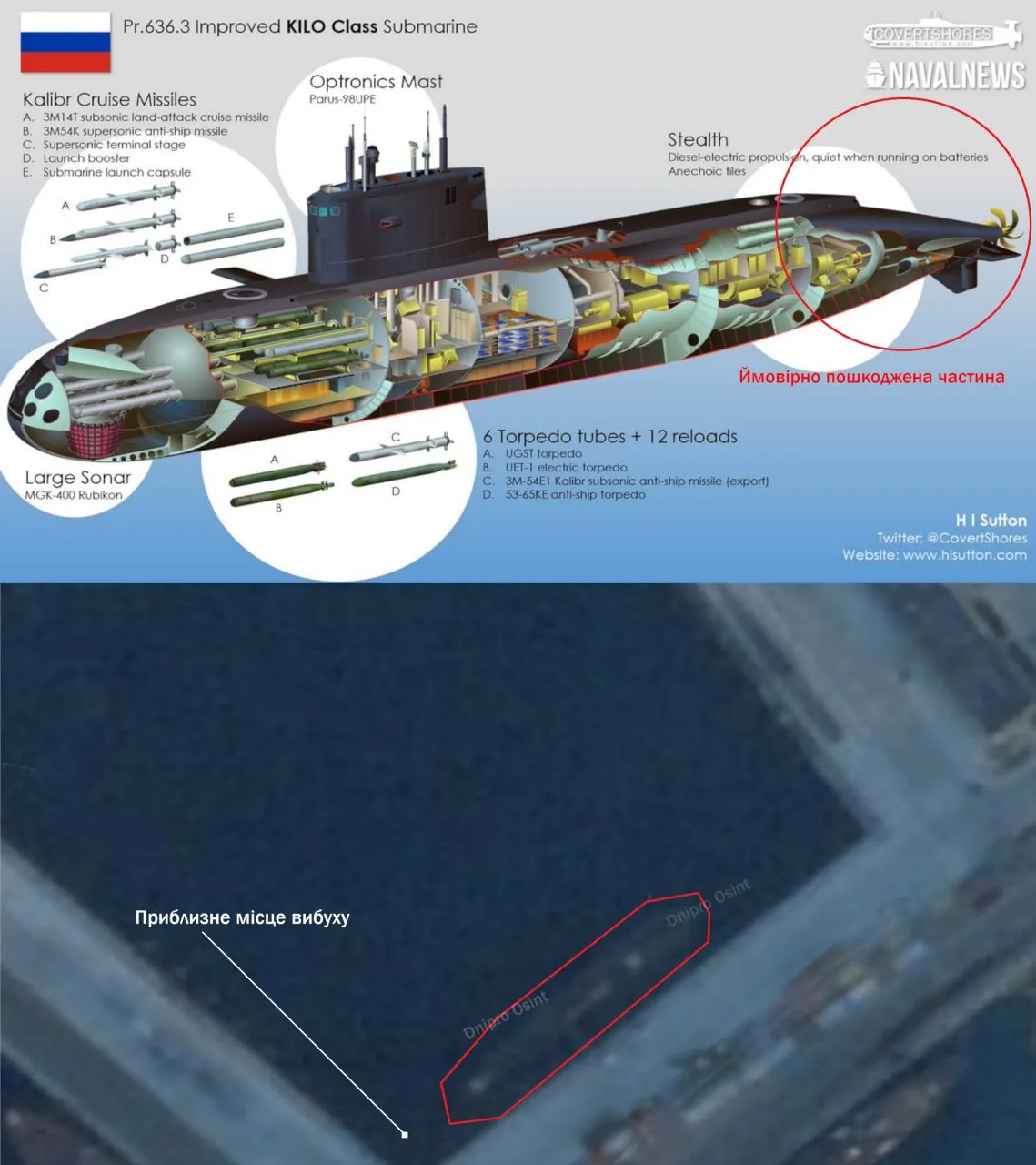 Телеграм-канал "Крымский ветер" обратил внимание, что на спутниковых снимках субмарина была расположена так, что основной удар, вероятнее всего, пришелся по кормовой части — в районе винта и силовой установки. На видео видно воспламенение топлива, а обломки от взрыва могли повредить и вторую подводную лодку того же класса, стоявшую рядом.