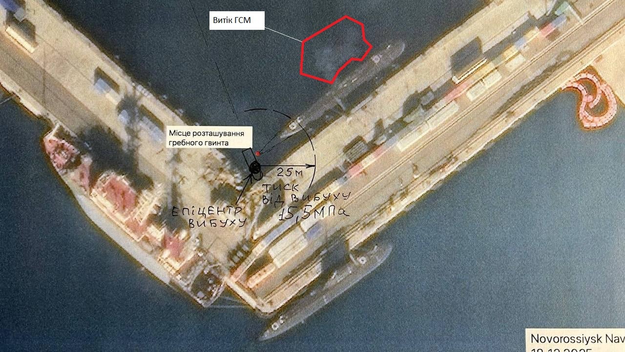 На опубликованном спутниковом фото схематично отмечены ключевые элементы удара: эпицентр взрыва расположен в непосредственной близости от кормовой части субмарины. Указан радиус поражения около 25 метров, что для подводного взрыва в замкнутом пространстве гавани означает крайне разрушительное воздействие.