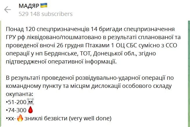На оккупированной территории Донецкой области украинские силы нанесли один из самых болезненных ударов по элите российской разведки. В ночь на 26 декабря подразделение "Птахи" 1-го отдельного центра СБС провело тщательно спланированную разведывательно-ударную операцию в населенном пункте Бердянское на временно оккупированной территории Донецкой области.