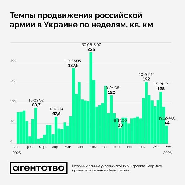 6 января стало известно, что скорость наступления армии РФ в Украине упала до минимума: за минувшие 7 дней враг захватил всего 44 км² территории, в зонах возле Константиновки, Северска и, конечно же, Покровска. Показатели меньше были только в сентябре 2025 года (38 км²).