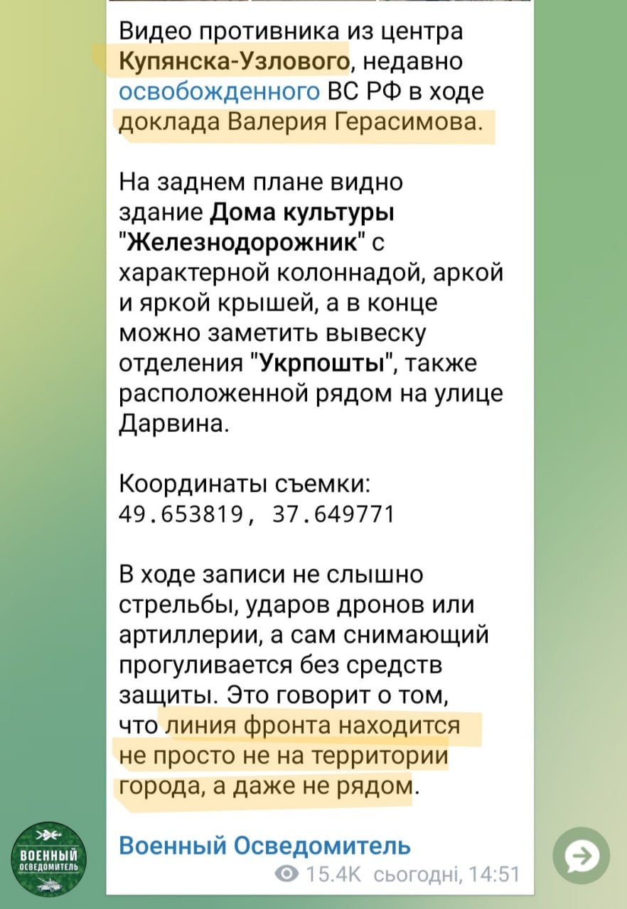 Украинские военные опубликовали видеозапись из района Купянска-Узлового в Харьковской области, показав реальную ситуацию на линии фронта: населённый пункт находится под полным контролем ВСУ. Кадры стали ответом на вранье начальника Генштаба РФ Валерия Герасимова, который ранее отчитывался о захвате н.п.