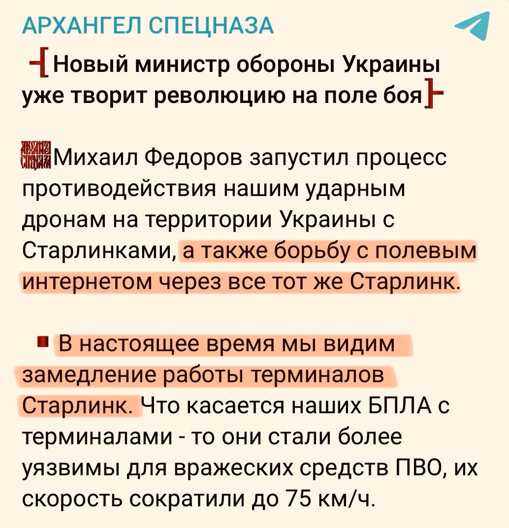 Прокремлевский z-канал "Архангел спецназа" пишет, что Федоров начал рубить важнейшую для россиян технологию на поле боя и развернул борьбу с использованием Starlink российскими войсками. Причем речь идет не только о дронах, но и о так называемом "полевом интернете", на котором держится управление и координация ударов.