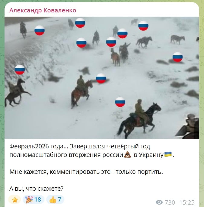 Коваленко приводит и показатель темпов. В январе российские войска заняли около 231 км² украинской территории, что почти вдвое меньше, чем в предыдущие месяцы, то есть продвижение есть, но оно дается медленнее и дороже, а это прямой признак истощения.