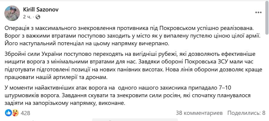 Об успешном завершении операции по максимальному истощению российских войск под Покровском сообщил военнослужащий Кирилл Сазонов, который сейчас служит в рядах ВСУ.
