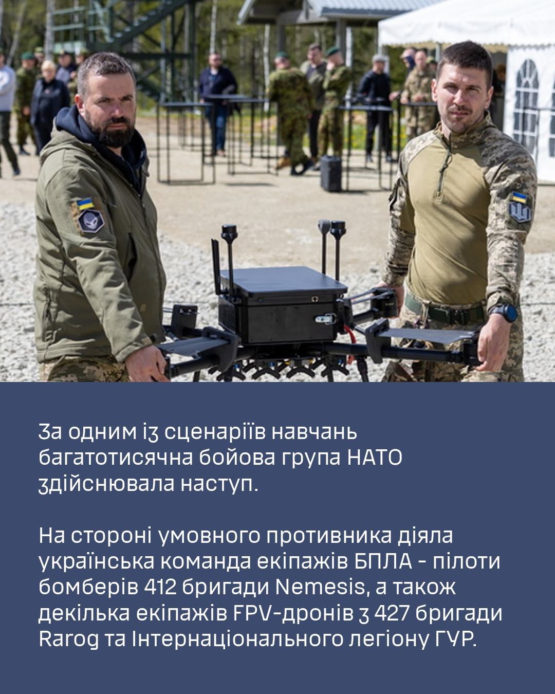 Помимо экипажей дронов-бомбардировщиков Nemesis, в учениях также приняли участие операторы БпЛА бригады СБС "Рарог" и Интернационального легиона ГУР МО.