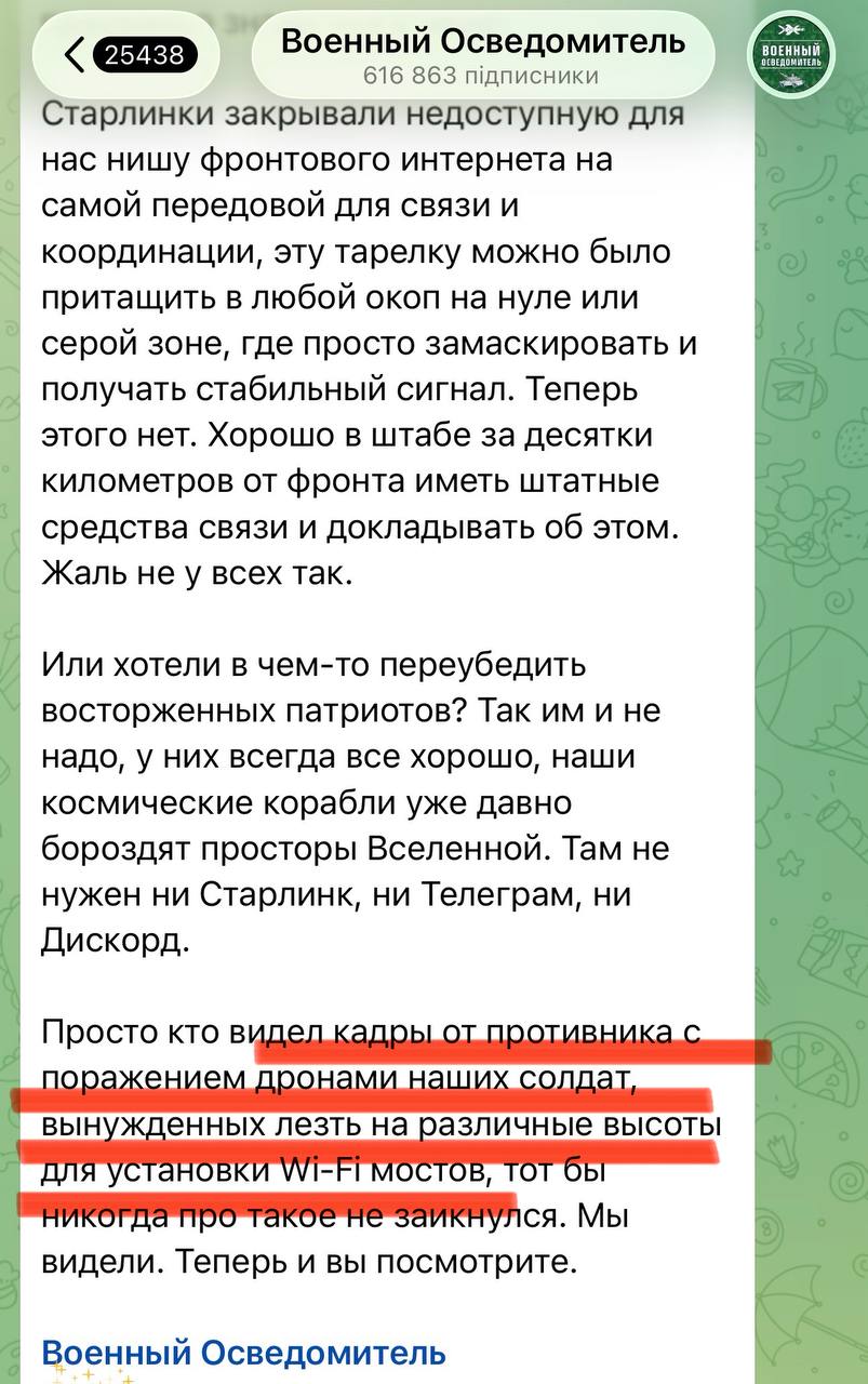 Когда нормальной защищенной связи не хватает, российские подразделения переходят на самодельные решения. Ставят оборудование на вышках, крышах, мачтах. Это не "техническая работа", это выход под удар: на высоте тебя видно лучше всего, а дрону не нужно выполнять сложный маневр "на земле".
