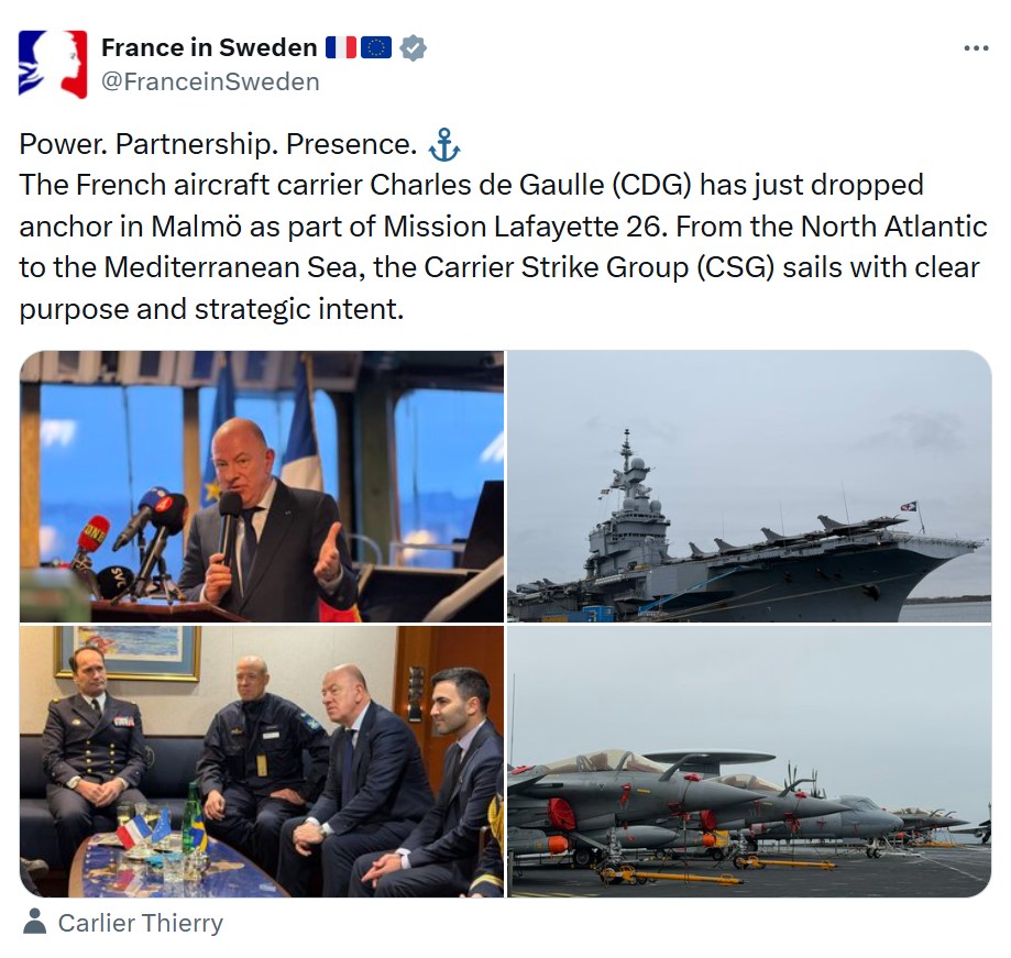 "Французский авианосец "Шарль де Голль" только что бросил якорь в Мальме в рамках миссии Lafayette 26. От Северной Атлантики до Средиземного моря авианосная ударная группа движется с четкой целью и стратегическими намерениями", – писало посольство Франции в Швеции на своей страннице в X и публиковало соответствующие фото.