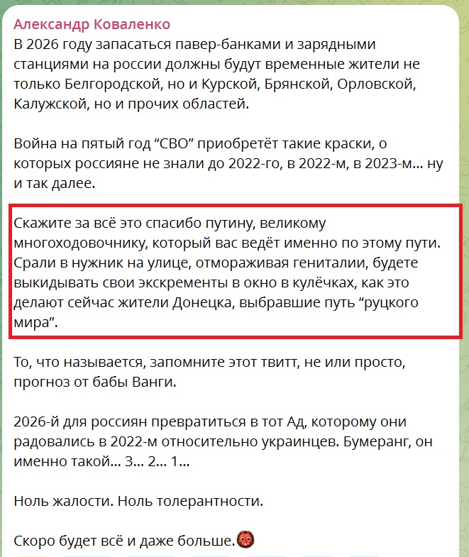 "Ноль толерантности. Скоро будет все и даже больше. Война на пятый год “СВО” приобретет такие краски, о которых россияне не знали до 2022-го, в 2022-м, в 2023-м… ну и так далее", - предупреждает он.