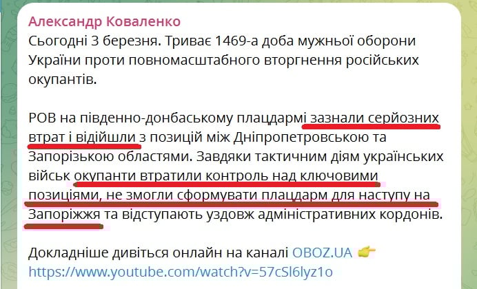 Российские оккупационные войска понесли серьезные потери на Южно-Донбасском направлении и были вынуждены отойти с позиций между Днепропетровской и Запорожской областями. Об этом сообщил военный эксперт Александр Коваленко, анализируя ситуацию на фронте.