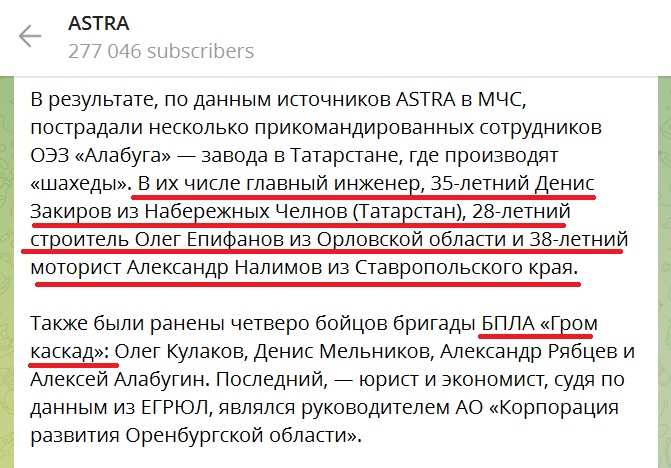 В результате удара ранения получили сотрудники особой экономической зоны "Алабуга" из Татарстана, именно там Россия организовала производство дронов типа "шахед". Среди пострадавших оказался главный инженер предприятия, а также несколько специалистов, прикомандированных к российским подразделениям на оккупированной территории.
