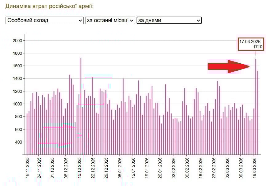 Коваленко утверждает, что уже вторые сутки наступательных действий показывают суммарные потери свыше 3 тысяч человек. На опубликованном графике видно, что 17 марта суточные потери российской армии достигли 1710 человек, что стало одним из самых высоких показателей за последние месяцы.