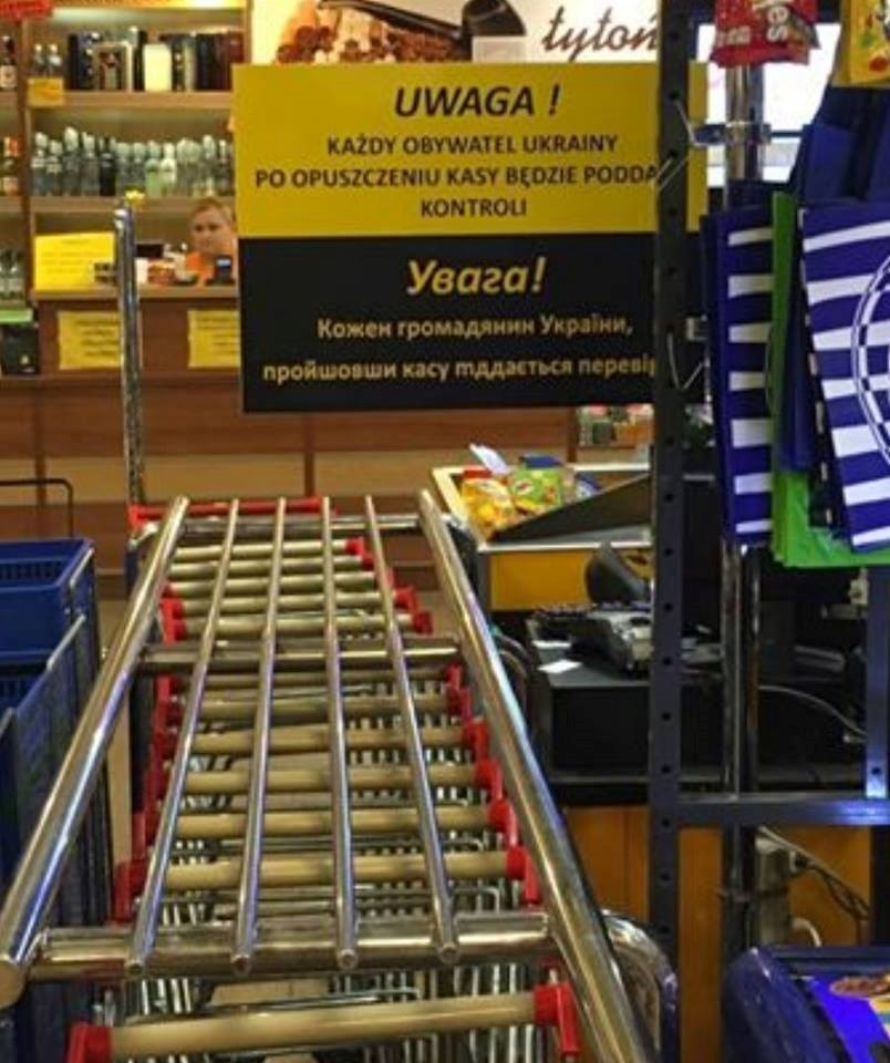 В польском населенном пункте Барлинек в одном из супермаркетов на входе появилась интересная табличка, направленная против украинцев. Надпись гласит: "Каждый гражданин Украины, пройдя кассу, подвергается проверке".